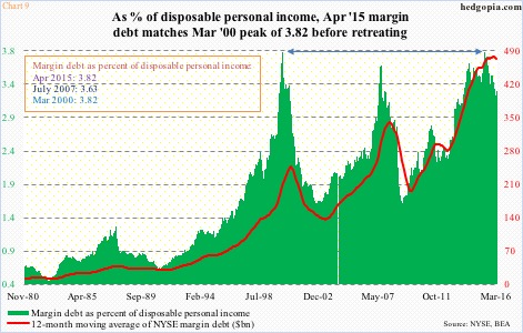 NYSE margin debt rose $10 billion in March to $445.8 billion. This was the first month-over-month increase in four months. However, an increase of a mere $10 billion in a month in which the S&P 500 rallied 6.6 percent speaks volumes about whether or not traders view the current environment as risk-on. Margin debt has dropped $61.3 billion from the April 2015 peak. As a percent of disposable personal income, that peak matched the March 2000 peak of 3.82 (Chart 9). There is plenty of unwinding left still.