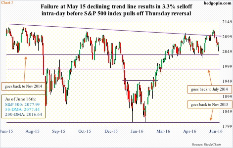 This is particularly so as the S&P 500 has failed to break out of the trend line drawn from the all-time high of May 2015 (Chart 3). Normally, a failure of this nature results in a sharp sell-off… has not happened yet. Yesterday, it reversed with a hammer, although volume could have been better.
