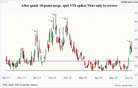 VIX’s candle yesterday has an ominous look to it (Chart 4). Several times in the past spot VIX has surged, only to reverse hard and then sell off. Daily conditions are grossly overbought. And in the event of a ‘no’ vote on Brexit on the 23rd, risk-off likely reverses fast near term.