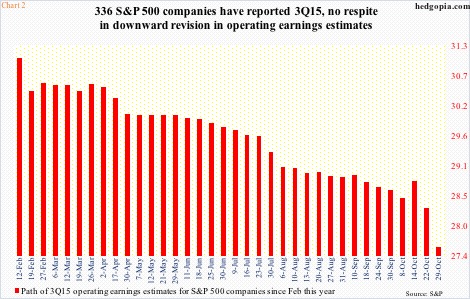Even with this level of downward revision, as of Thursday last week, only 70 percent have beaten on an operating basis (and only 42 percent on an as-reported basis). With two-thirds of the way through, 3Q estimates – now at $27.55 (Chart 2) – continue to head lower; 2015 is at $109.11, down from $110.98 when the quarter ended.