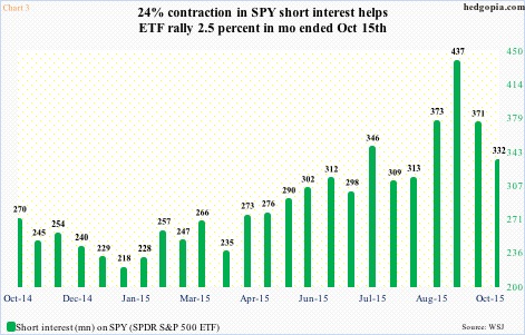 SPY short interest had been building a while, having jumped 86 percent between the end of March and the middle of September (Chart 3). Then in the next month, it declined 24 percent, lending a hand to SPY’s 2.5-percent rally.