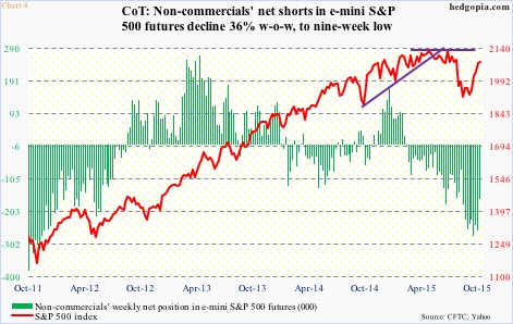 Non-commercials have stayed net short e-mini S&P 500 futures since March (Chart 4) – with gradual accumulation. In the week ended October 6th, they held 278,179 contracts, and have been reducing since, even as SPY has grinded higher. In the latest reporting period (last Tuesday), net shorts declined 36 percent, to 166,039 contracts, with SPY rallying 1.7 percent. The ETF rallied another 1.4 percent from the Tuesday close to the Friday high. So it is possible net shorts have gone down even more. We will find out this Friday.