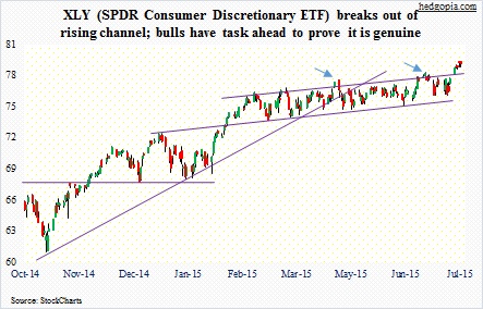 The question becomes pertinent as XLY broke out last week – out of a five-month-long slightly rising channel. In the past three months, there have been two false breakouts (arrows in the chart below). On both occasions, the breakout failed within a few days. This time around, it broke out on Monday, and built on it the next four sessions, though only slightly.