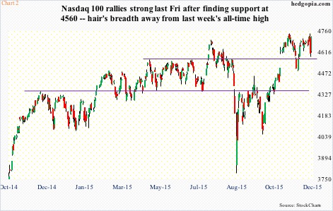 On the S&P 500, amidst heavy selling on Thursday, buyers defended the rising 50-day moving average. On the Nasdaq 100, the 4560 level drew buyers; this support goes back to April this year (Chart 2). And on the Dow Industrials, 17400 was defended.