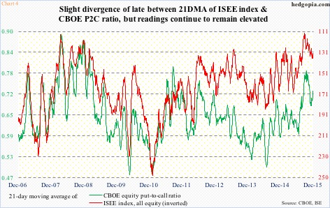 In Chart 4, a 21-day moving average of both the CBOE put-to-call ratio and the ISEE index (equity) has been calculated. The latter is a call-to-put ratio, hence inverted. As can be seen, leading up to late-August lows in stocks, there was a major spike in both the green and red lines. By nature, as these conditions get unwound, stocks get a tailwind. This phenomenon is already unfolding as expected, and probably has a long way to go still if past is any guide.