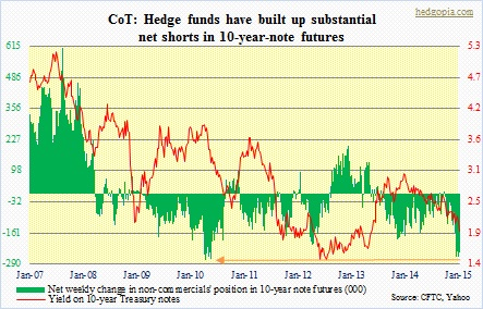 The following are futures positions of non-commercials as of January 6th (Tuesday). Dollar and ten-year notes jump out the most. 10-year note: Substantial net shorts have been built up. In the prior week, large speculators were most short since mid-May … Continued