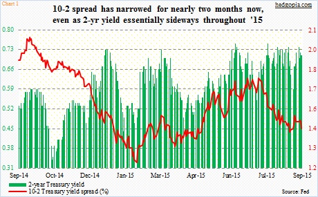 Gold continues to act as if it expects a hike as soon as this month. The FOMC meets on the 16th-17th. On Friday, post-August jobs report, GLD, the SPDR Gold ETF, shed 0.3 percent. The two-year Treasury yield was unchanged … Continued