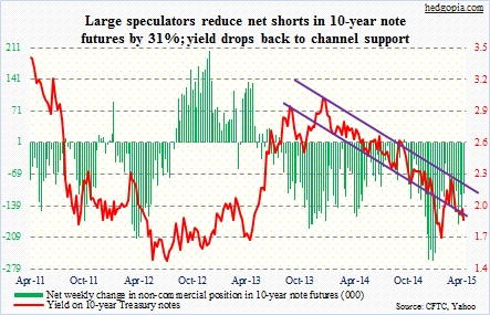 The following are futures positions of non-commercials as of April 14, 2015.  Change is week-over-week. 10-year note: The 10-year yield fell in all five sessions.  Friday could have been different as March core CPI was initially treated as hawkish, but … Continued