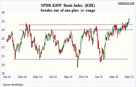 A month ago, KBE, the SPDR S&P Bank ETF, looked on the verge of a breakout (more here). Here we are, one month later, the ETF has indeed broken out. It has the potential to be a major breakout, as … Continued