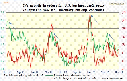 Setback in orders for business-capex proxy; down four consecutive months Inventory-to-order ratios, nowhere near previous peaks, trending higher Zero-bound suppressed rates probably impacting incentive to borrow The much-anticipated capex boom in the U.S. will just have to wait a while … Continued