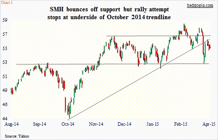 SMH’s latest rally attempt gets rejected at underside of broken Oct 2014 trendline Past 3 months, some semi outfits have seen estimates revised up, some down ETF has retraced 61.8% of Mar 00-Nov 08 decline; may mean pause/stop In the … Continued