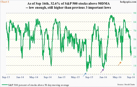 As of last Friday, only 32.6 percent of S&P 500 stocks were above 50-day moving average, earlier having dropped to 29.8 percent on Wednesday. This compares to 22 percent on June 27 (orange arrow in Chart 1) when the S&P … Continued