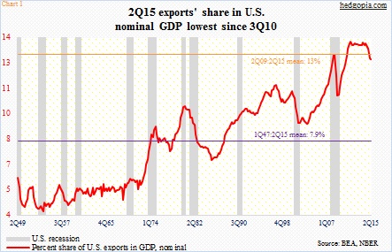 U.S. exports have been under pressure since they peaked at a seasonally adjusted annual rate of $2.36 trillion in 3Q14; 2Q15 was $2.28 trillion. As a percent of nominal GDP, exports’ share in 2Q15 was a full percentage point lower … Continued