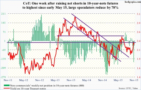 The following are futures positions of non-commercials as of November 10, 2015.  Change is week-over-week.  (Due to Veterans Day, a Federal holiday, last week, the CFTC released numbers on Monday.) 10-year note: “Muted global economic growth will not support a … Continued