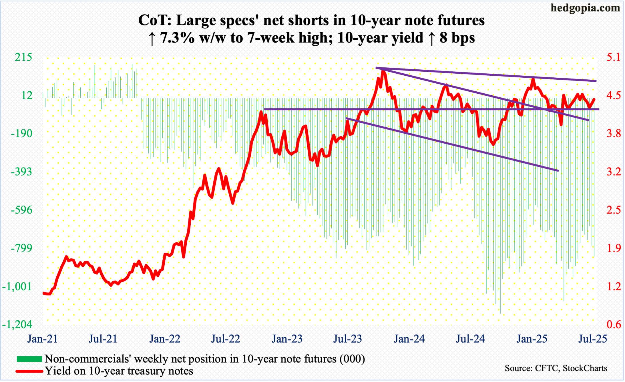 Following futures positions of non-commercials are as of July 8, 2025. 10-year note: Currently net short 840.6k, up 56.9k. Once again, non-commercials are adding to their holdings of net shorts in 10-year note futures, with this week adding 7.3 percent … Continued