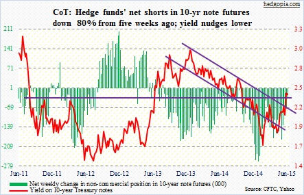 The following are futures positions of non-commercials as of June 2, 2015.  Change is week-over-week. 10-year note: Yields have decisively broken out of a five-month downtrend channel.  The only question is what triggered this. To quote the Beige Book: “The … Continued