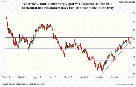 Since spot West Texas Intermediate crude bottomed intra-day at $26.05/barrel on February 11th and began to rally, resistance points have fallen one after another. First went $34-$35, then $40, followed by $42-$43 and then $47-$48 (Chart 1), rallying past both … Continued