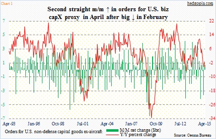 2nd straight M/M rise in orders for U.S. business capX proxy in April For several months beginning June, hurdle rate quite high for Y/Y growth Six years into expansion, ZIRP probably not confidence booster among CEOs Phew! A sigh of … Continued
