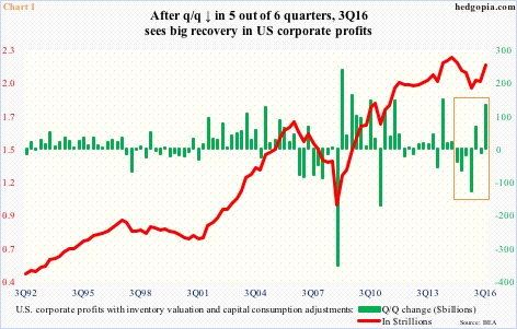 U.S. corporate profits adjusted for inventory and depreciation in 3Q16 grew the most quarter-over-quarter since 2Q14. They rose 6.6 percent to a seasonally adjusted annual rate of $2.15 trillion, breaking five consecutive quarters of year-over-year decline (Chart 4). Profits peaked … Continued