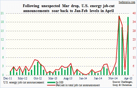April energy job cuts resume Jan-Feb downward momentum