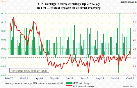 Last week when October’s jobs report was published, there was one particular data point that really jumped out. The average hourly earnings of private-sector employees jumped 2.5 percent year-over-year, to $25.20 (Chart 1). This was the fastest rate employee earnings … Continued