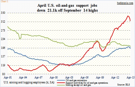 U.S. oil-and-extraction jobs continued to drip lower, down 7.1k from the October 2014 high of 201.5k (down 3.5 percent by April). The curve is much steeper in support jobs, having lost 21.1k jobs from the September 2014 peak of 337.6k … Continued