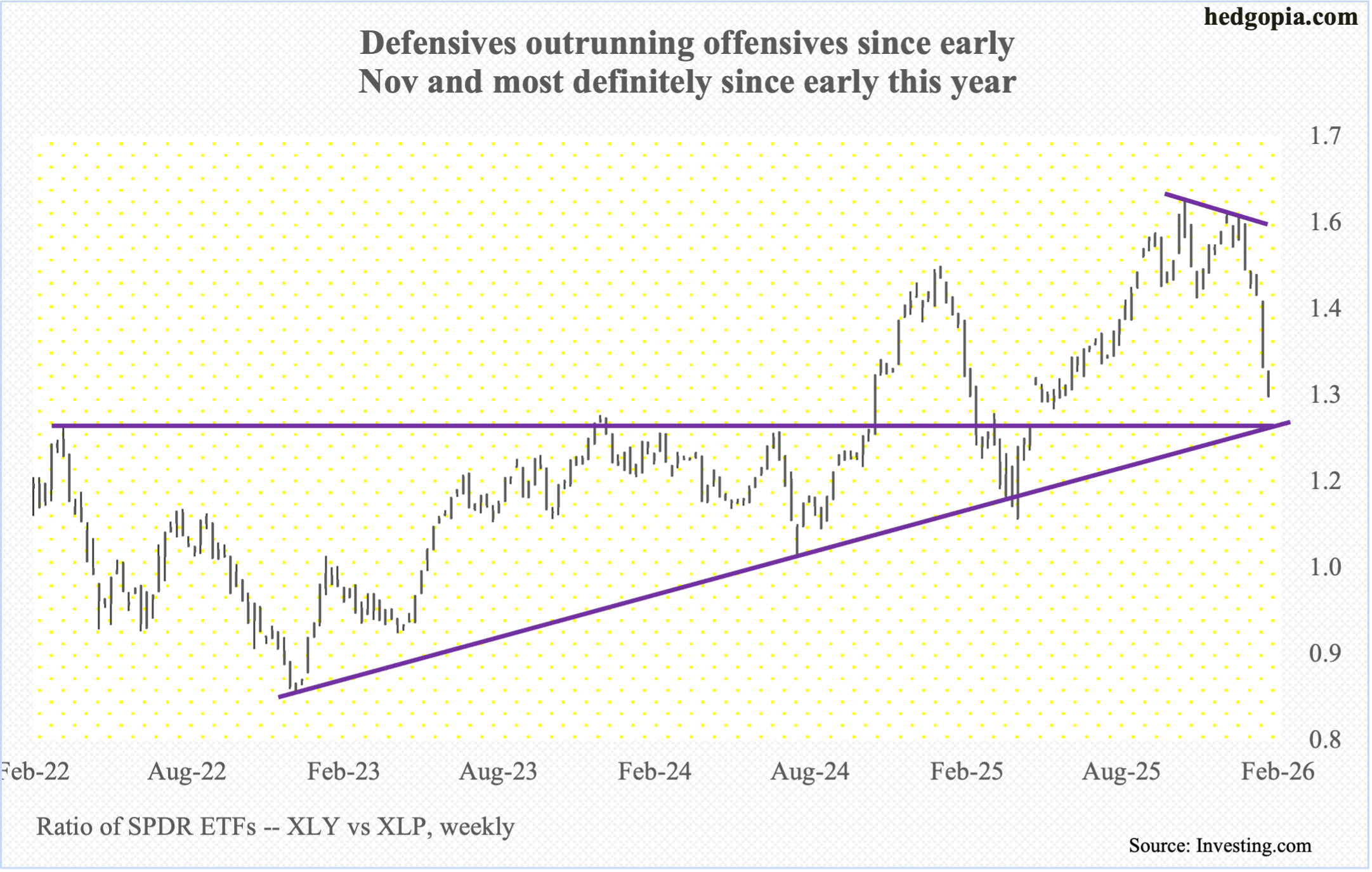 Equity traders have adopted a defensive posture since early November, even as large-cap equity indices went on to post newer highs. The likes of the S&P 500 are now catching up to it. The ratio of XLY (SPDR Consumer Discretionary … Continued