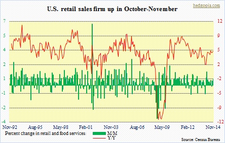 U.S. retail sales jumped 0.7 percent month-over-month in November. Growth was well spread out – from cars to clothing to furniture to electronic items. Gasoline, of course, was down – down 0.8 percent m/m. But that drop was not sufficient … Continued
