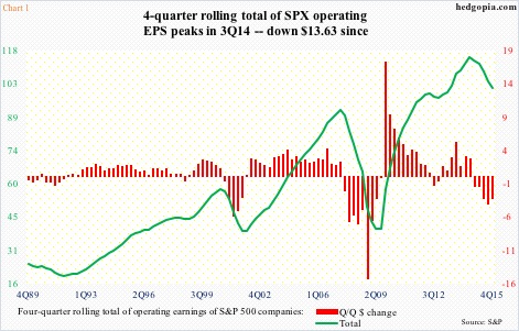 Arguably, if U.S. stocks followed crude oil or economic data, they probably would be a lot lower. Operating earnings of S&P 500 companies peaked at $29.60 in 3Q14, and have been decelerating since. With 474 companies having reported 4Q15 (as … Continued