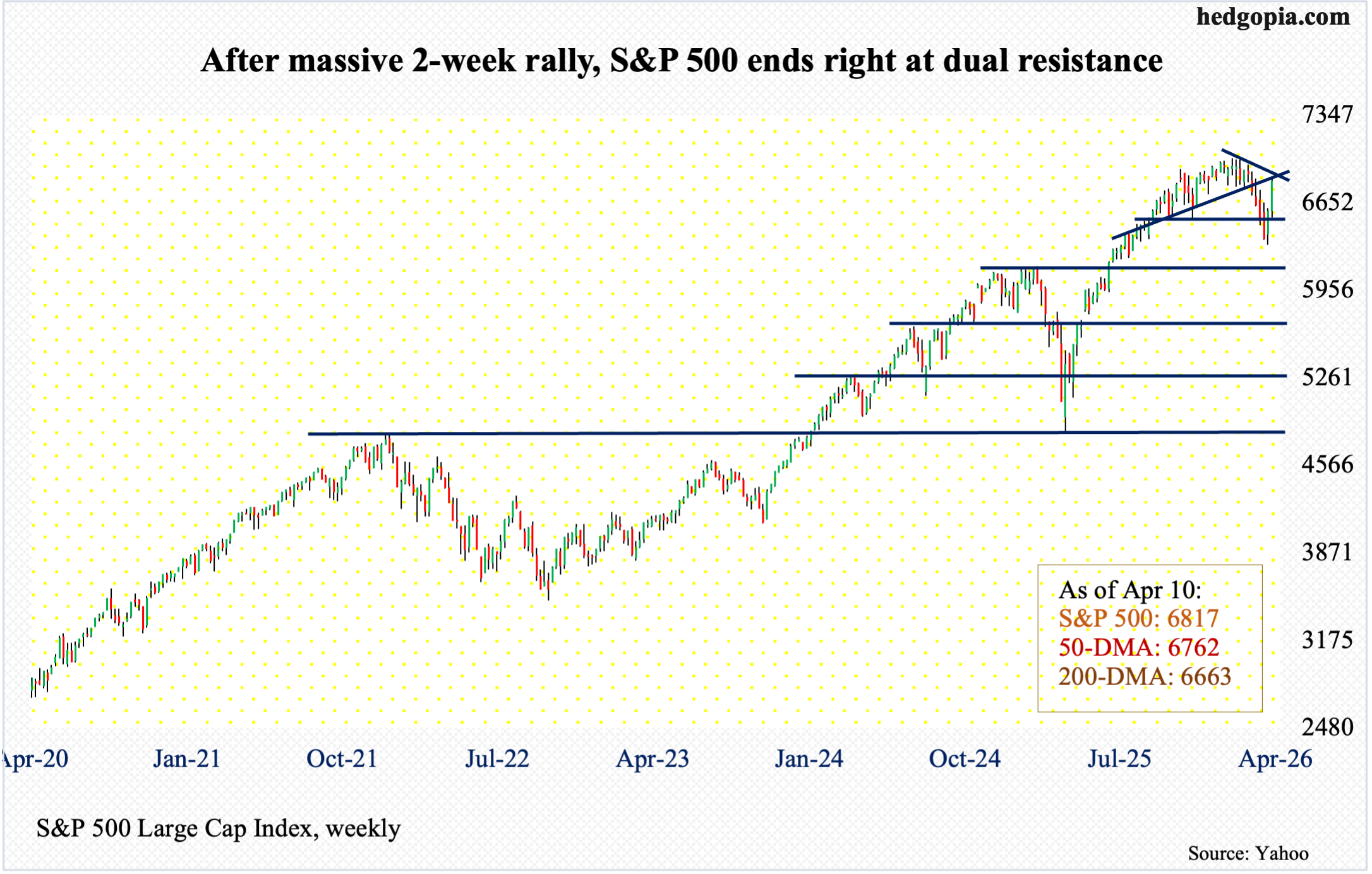 VIX last week breached late-December trendline support but remains above the important 200-day. Concurrently, after a massive rally off the March 30 low, which was probably aided by short-covering, the major equity indices ended last week right at/near important resistance. … Continued
