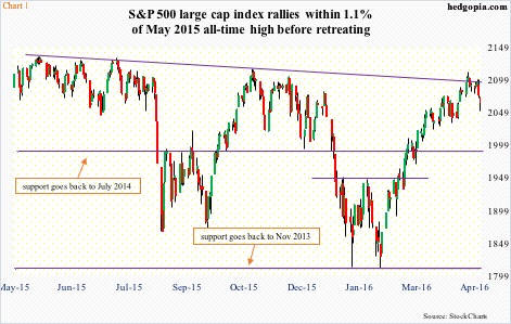 The S&P 500 large cap index lost 1.3 percent last week. Intra-day, off the April 20th high through last Friday’s low, it is now down 2.8 percent. The index retreated after unsuccessfully trying to break out of a declining trend … Continued