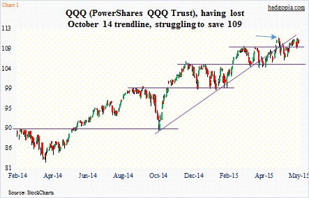 The PowerShares QQQ (110.05), the ETF that tracks the Nasdaq 100, seems to want to go lower, at least near-term. When the Qs broke out of 104-plus in February, it quickly added nearly four percent, rallying seven-plus percent for the … Continued