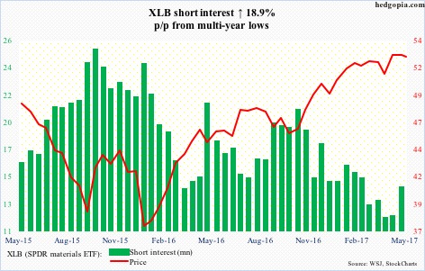 Here is a brief review of period-over-period change in short interest in the May 1-15 period in nine S&P 500 sectors. XLB (SPDR materials ETF) Support at 51-plus was defended yet again on May 18. At the same time, bulls … Continued