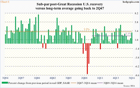 Of the 29 quarters post-Great Recession, only six have grown above the 2Q47-3Q16 average of 3.2 percent (Chart 1). That is how anemic this recovery has been, with the 3Q09-3Q16 average of 2.1 percent.