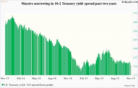 Over the past two years, the 10-2 spread has undergone massive narrowing (Chart 1).