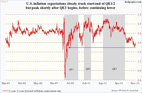 Markets are not pricing it in either. Five-year inflation expectations five years from now are languishing below two percent. In fact, the red line in Chart 2 peaked just under three percent in the early months of 2013 – shortly after QE3 got underway.