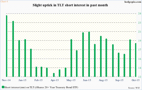 Similar sentiment is reflected in how shorts are positioned in TLT, the iShares 20+Year Treasury Bond ETF. At the end of June, short interest peaked at 20.8 million shares, before coming under sustained pressure and dropping to 16.4 million three months later. End-October was 18.6 million. At the end of November last year, short interest was 24 million (Chart 4).