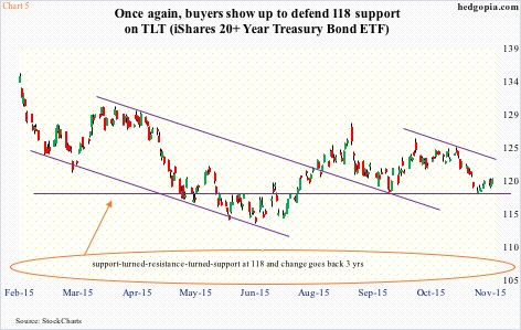 This is creating opportunity in TLT. The November 9th peak in the 10-year yield coincided with TLT finding support – once again – at 118-ish. This support goes back three years, and has proven to be an important battle line between bulls and bears (Chart 5).