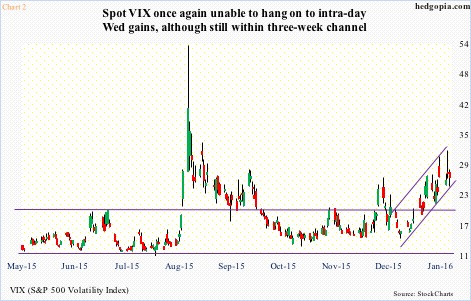 On Wednesday, spot VIX surged all the way to 32.09, but closed the session 4.50 points off the session high. It began to sell off well before the S&P 500 began to attract bids. The session nearly produced a gravestone doji (Chart 2).