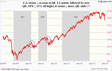At the same time, markets are now aware that years of QE have not been much help to the real economy, only assets. Notice the correlation between the S&P 500 and QE in Chart 4. At some point, stocks will stop reacting positively to QE… when the collective wisdom of market participants decides that monetary policy has run its course.