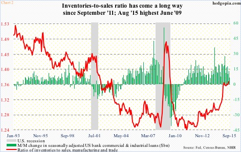 In August, manufacturing and trade inventories were $1.81 trillion, versus sales of $1.32 trillion. As U.S. banks’ commercial & industrial loans picked up, so did the red line. The ratio of inventories to sales began to surge particularly since July last year. The August reading 1.371 was the highest since 1.385 in June 2009.