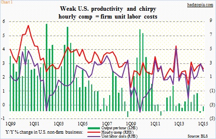 Growth in hourly comp, in the meantime, was revised higher y/y for both 4Q14 and 1Q15 – from 2.5 percent to 2.9 percent and from 1.7 percent to 2.1 percent respectively. As a result, increase in unit labor costs y/y was revised higher from 2.6 percent to three percent and from 1.1 percent to 1.8 percent, in that order. Q/Q, they shot up 5.5 percent in 4Q14 and 6.5 percent in 1Q, revised higher from prior 4.1 percent and five percent respectively.