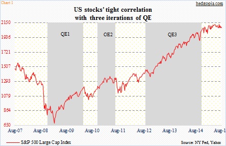 Hence investor unease when QE3 ended last October. As it turns out, stocks did just fine. As a matter of fact, they kept rising. The S&P 500 Index, for instance, only peaked in May; the past three months, it has lost its mojo – playing ping pong between 2040 and 2130.