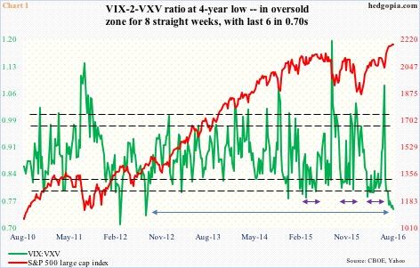 When the VIX-to-VXV ratio first entered oversold territory in the June 27th week – that was the week after Brexit – the S&P 500 large cap index was more than 100 points lower. Now, with a 10-percent rally since that low, signs of fatigue are showing up left and right.