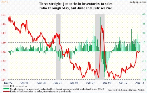 In Chart 2, a ratio of inventories to sales (U.S. manufacturing and trade) has been pitted against U.S. banks’ commercial & industrial loans.  The ratio has had a steady rise since March 2011 and particularly since July last year (Chart 2).  After some back and forth the last several months, July (1.365) is nearly back up to the May high (1.368).  In the meantime, there has been a healthy growth in C&I loans, some of which were probably used to finance these inventories.Chart 2