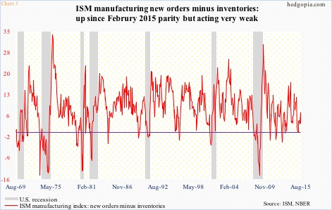 Inventory remains elevated even as orders are coming in weak.  Chart 3 plots the ratio of new orders to inventories in ISM manufacturing against U.S. recessions.  In February this year, the red line did drop to unity, before rebounding.  August once again dropped, to 3.2.