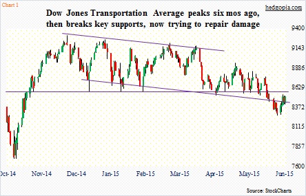 Much ink has been spilled over how U.S. transport stocks have been severely underperforming stocks in general. The Dow Jones Transportation Average peaked late November last year, then proceeded to trade within a declining channel, which it briefly fell out of toward the end of May. In the meantime, it has lost crucial support at 8550-8600 (Chart 1).