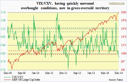 The ratio of VIX to VXV is below 0.80 in early trading today.  Early October, it was grossly overbought and was begging us to go long stocks.  Now it is the opposite.  Near-term volatility has collapsed.  In the past, whenever the ratio has gone this low, or in the neighborhood, it has paid off to get cautious on stocks.VXV, VIX ratio; SPX