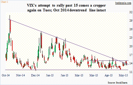 Since April, intra-day the so-called fear index has traded above 15 nine times, and only once has it been able to close out above (Chart 1). That was April 1, but it closed under 15 the very next session. The latest attempt was Tuesday; 15 was tagged, and that was it. Now it is sitting right on its 50-day moving average.