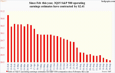 Quarterly estimates obviously are on the same trajectory. During the same period, estimates for the third quarter have gone from $34.86 to $28.61 (Chart 1 only goes back to February this year.) If 3Q estimates are met, earnings would still be down 3.3 percent from last year’s $29.60. For the year, earnings are slated to drop 1.8 percent.